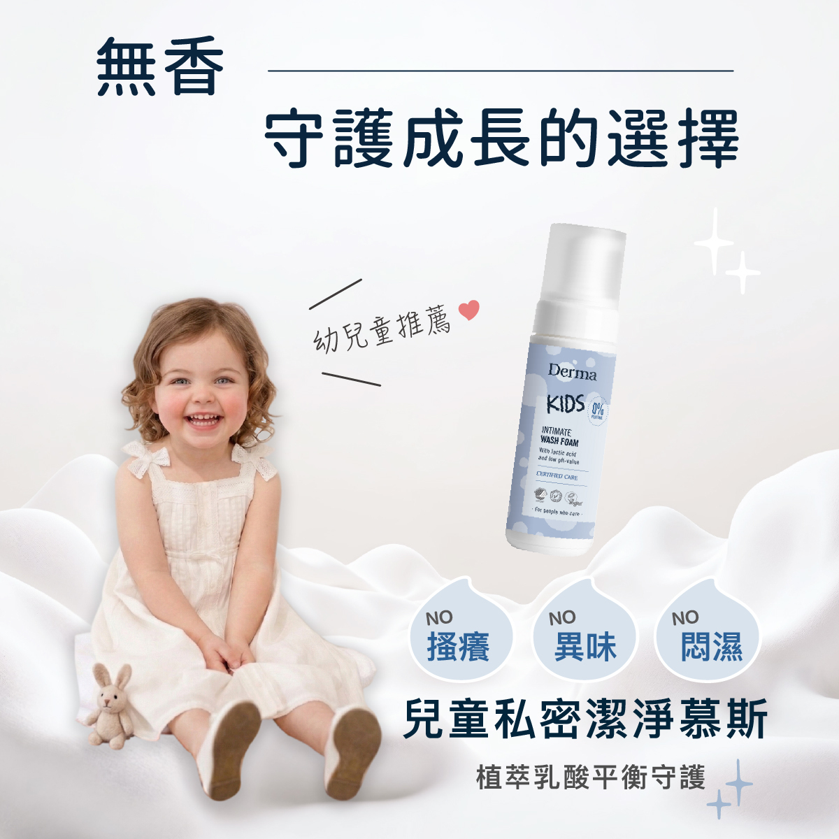 專為幼兒童設計的私密處潔淨慕斯,捨棄不必要的化學添加,採用植萃配方,以「先舒緩、後保濕、再防護」的三重呵護機制,陪伴孩子健康成長,告別悶癢與不適。