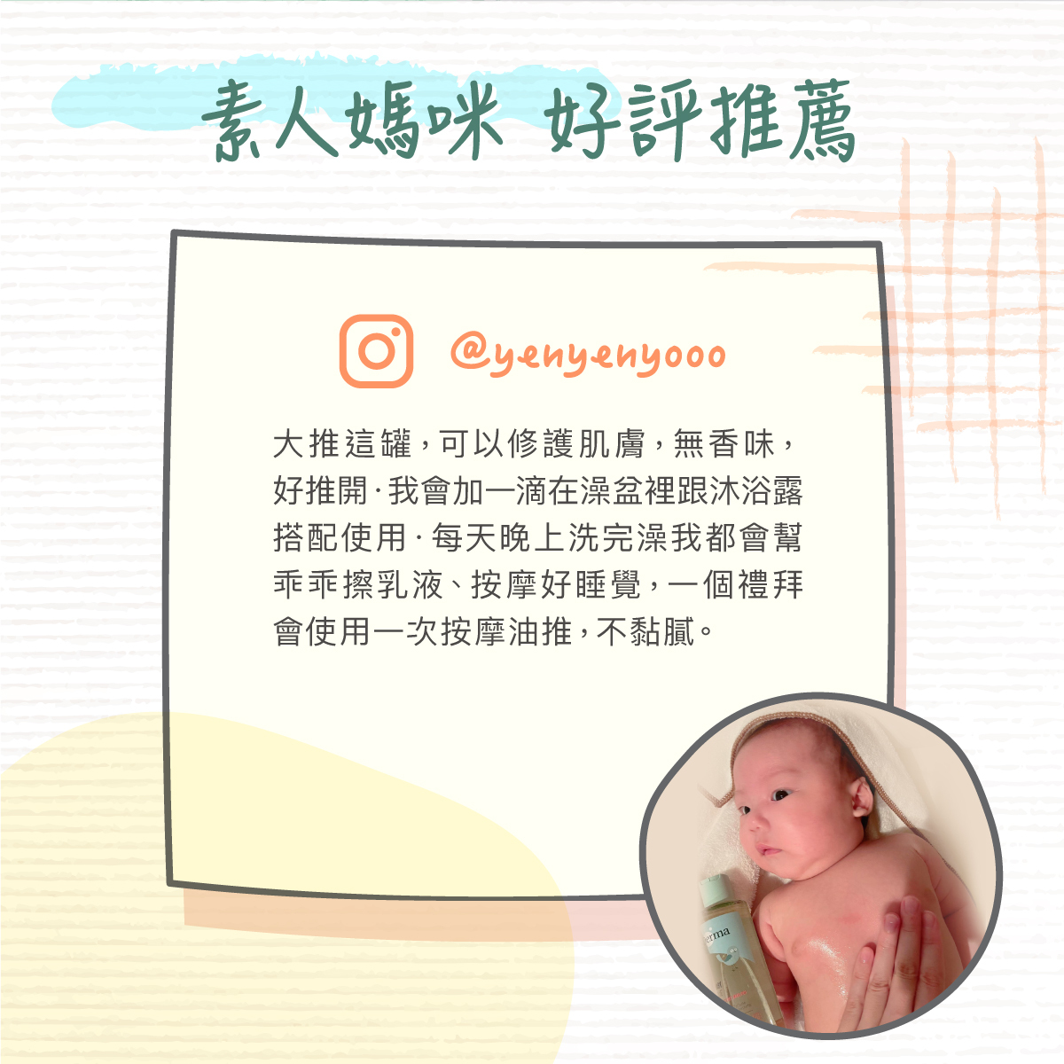 按摩、護膚、泡澡3合1,通過5大世界級認證,不含環境荷爾蒙及已知過敏原10大不添加的單純成分,溫和呵護嬌嫩肌。3重滋養成分-維生素E、黃金比例植萃油、獨特配方Olus油,加強滋潤肌膚並保濕鎖水,舒緩乾澀、乾癢等不乖膚況,養成寶寶原生Q彈肌!