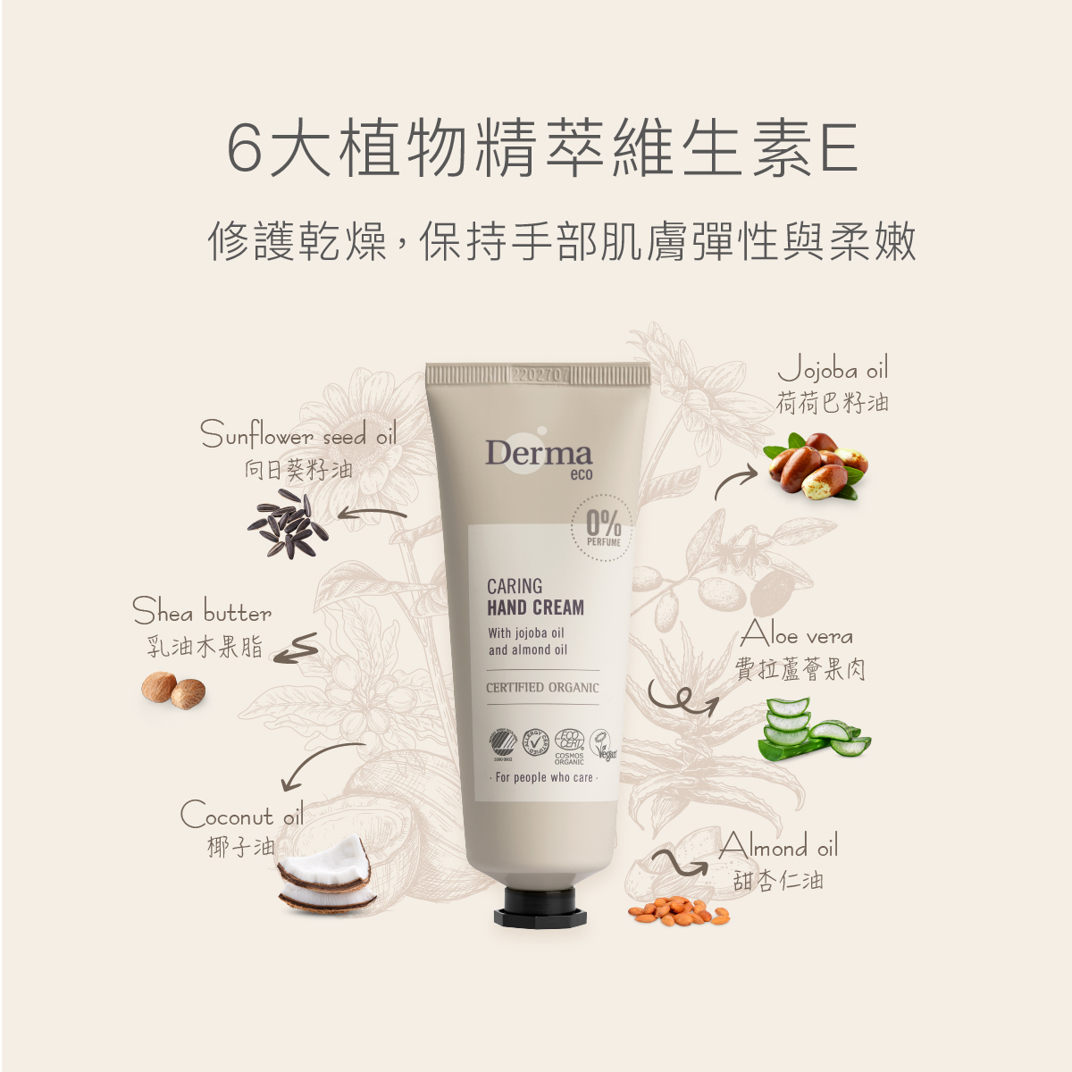 告別手部乾裂/乾癢恢復柔軟原生肌,蘊含6種獨家植物精萃並添加維生素E製成,極致修護肌膚乾燥。細緻質地迅速被吸收,零負擔不油膩,讓手部揮別乾燥,變得柔滑又細緻。